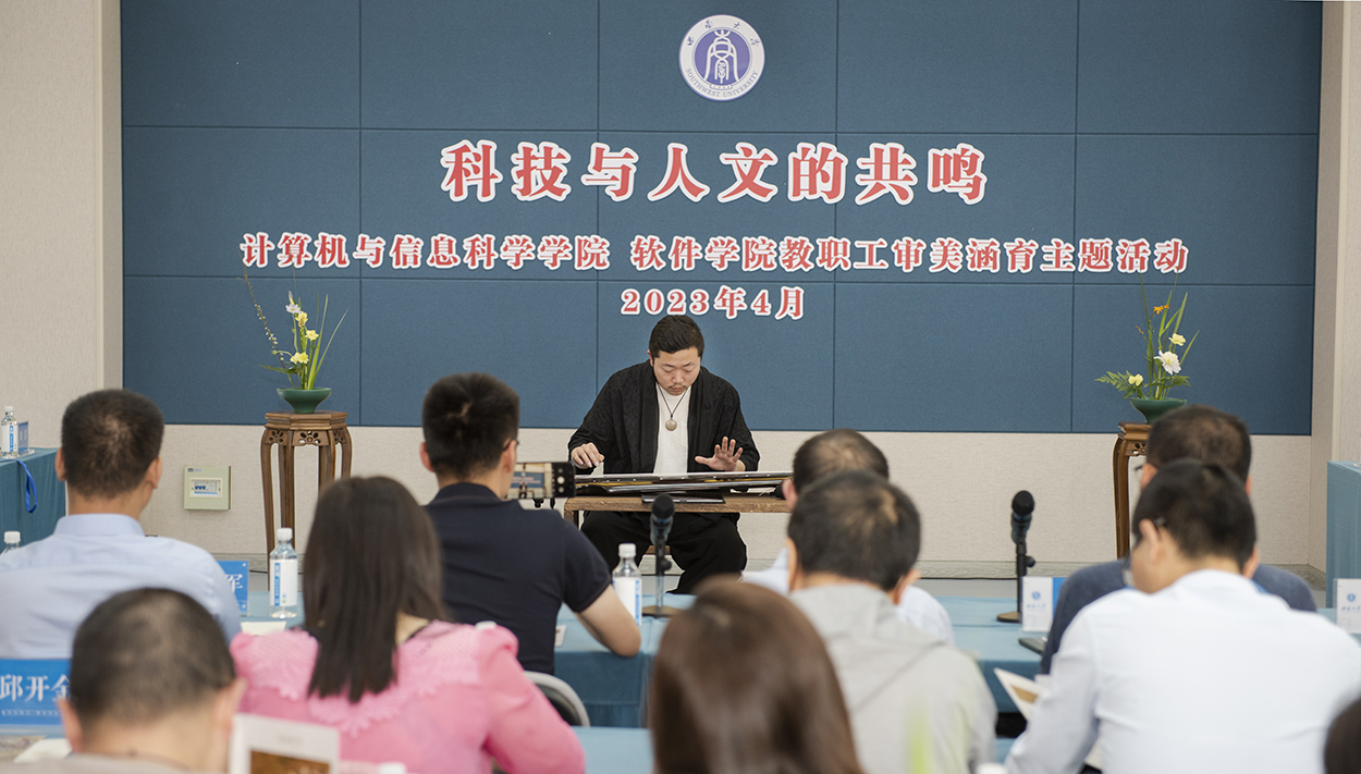 活动从古琴鉴赏开始。曾在重庆施光南大剧院、重庆歌剧院音乐厅举办过独奏音乐会的青年古琴家刘雳老师向在座老师们详细介绍了古琴的历史、形制及音位等,并现场演奏三曲经典古琴曲。《流水》清澈的泛音犹如滴滴清泉汇成流,令人感到清丽、高雅。《潇湘水云》带人走进云水苍茫的湖光山色之美。压轴曲目《二泉映月》含蓄又有张力,将盲艺人细微的内心世界和强烈的情感表现的淋漓尽致。