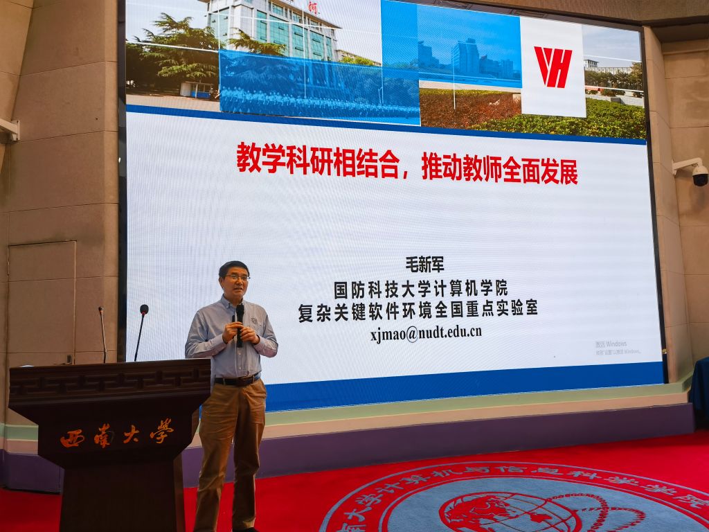 会上,毛新军教授以“教学科研相结合,推动教师全面发展”为题,围绕为什么要将教学和科研相结合、如何实现教学和科研结合等内容,阐述高校的三大使命是人才培养、科学研究和社会服务,强调根本使命在于人才培养,要坚定育人初心、坚定育人重心、坚定育人中心。毛教授聚焦产学研的结合,认为要将产业界的主流技术和方法引入专业教育、课程教学和人才培养;以代码为基础,让学生更易于理解、掌握和运用;强化课程综合实践,达成能力素质培养。真正做到教学科研相结合,深化科学研究推动教学改革,求真务实推动教学改革和科学研究。