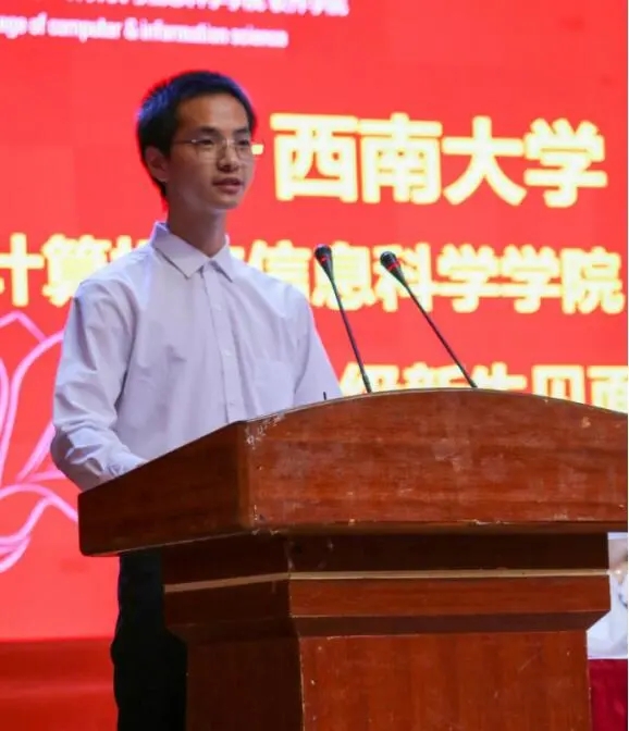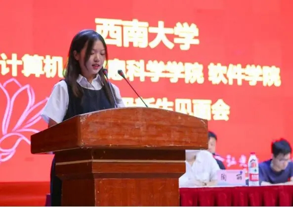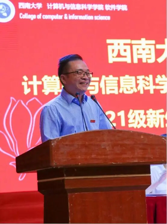 随后2021级本科曾紫菡同学代表新生发言,号召同学们牢记“做人做事做学问,尽心尽力尽责任”的院训,站在新的起点,不畏艰险,实现梦想,在计信院的大舞台度过人生最美好的大学时光。