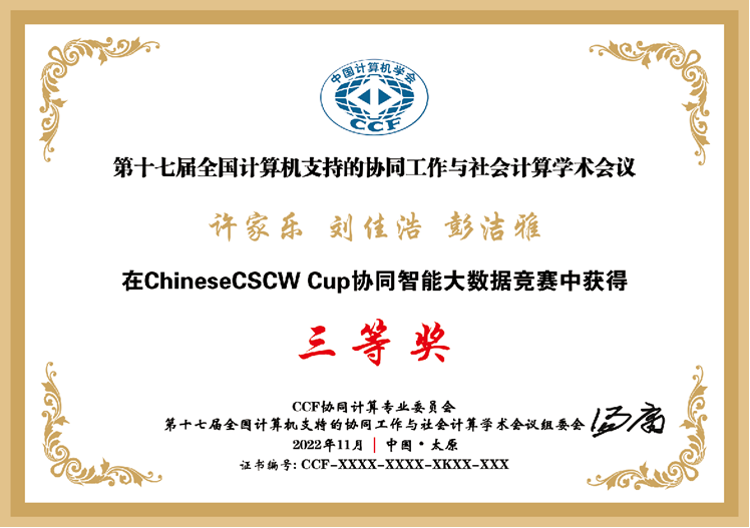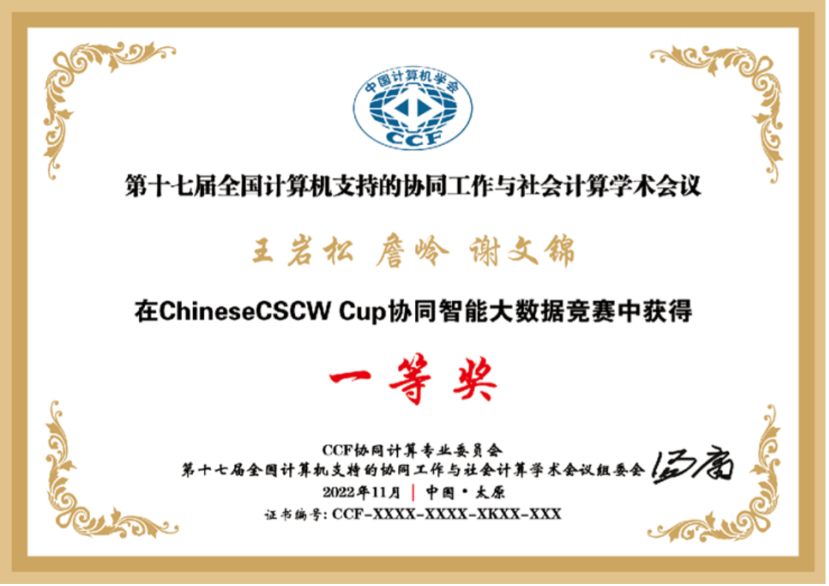 近日,由中国计算机学会(CCF)协同计算专委会组织的ChineseCSCW2022协同智能大数据竞赛在山西太原成功举办,我院“复杂系统与交叉科学应用”团队研究生组建的三支参赛队伍分别获得一等奖、二等奖和优胜奖。“复杂系统与交叉科学应用”团队已连续2年包揽此项比赛的一等奖(去年报道见//krcomic.com/info/1040/1800.htm),展现了团队在社会计算领域的研究实力。