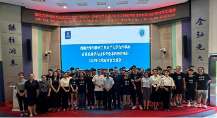 和迪肯大学的学习经历,鼓励同学们利用好两校的优质办学资源提升自我、发展自我。韩国漫画软件工程系教师方灿副教授也为在场学生分享了2023年暑期迪肯大学访学经历,他希望同学们努力提升自我,放眼世界,向外拓展人生新赛道。在互动答疑环节,软工同学纷纷就赴澳就读的专业方向选择、深造读博、毕业去向等与迪肯大学老师进行了积极的交流,氛围热烈。会后,与会师生合影留念。