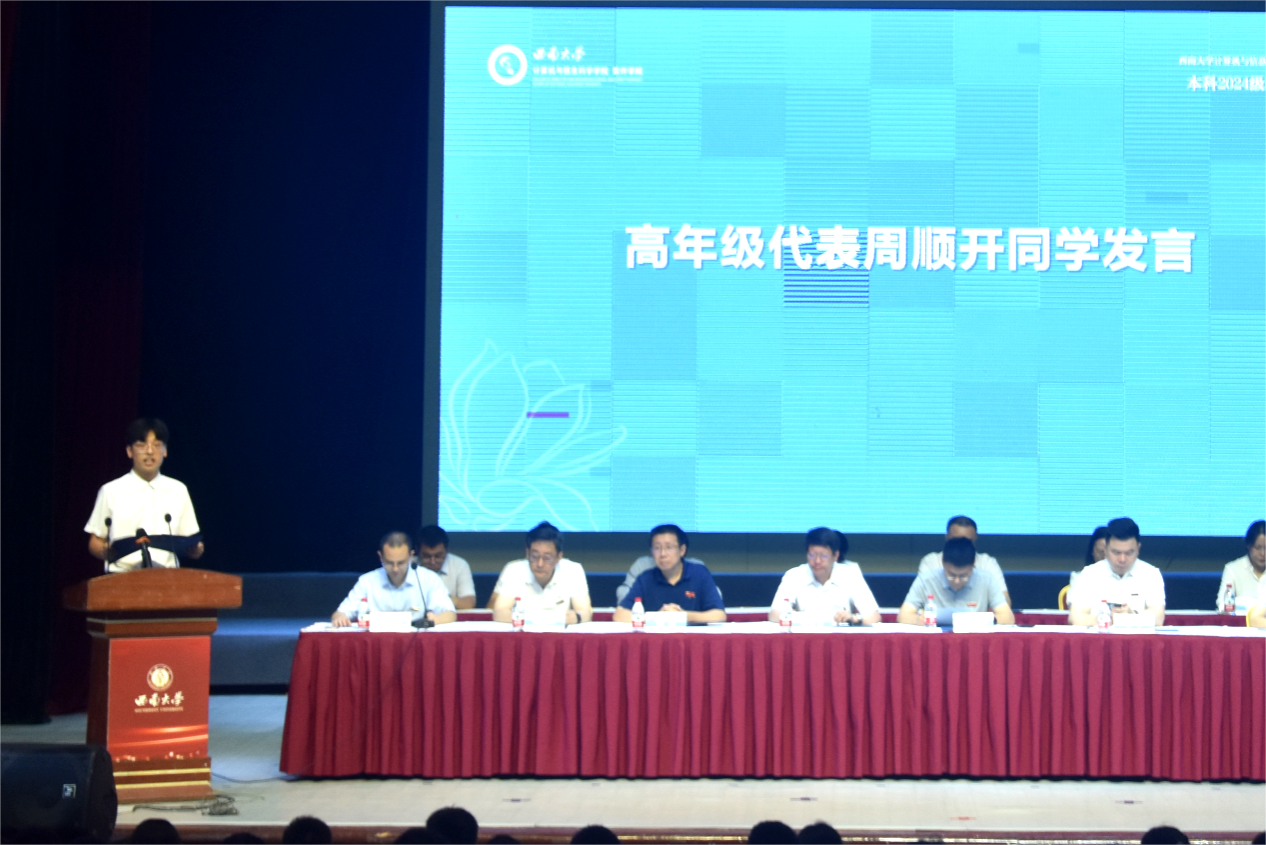 周彦晖老师作为教师代表寄语,他表示,作为计信学子应该肩负起推动未来科技进步的责任。首先,在学习方面,他鼓励同学们转变观念和方法,构建自主学习能力,独立思考,学以致用;其次,在个人发展方面,建议同学们要高度重视目标和规划,做好眼前的事,才能为不确定的未来做好准备。最后,他希望同学们学会理解和包容,积极参加各类校园文化活动,培养体育爱好,养成运动习惯,快乐而全面地发展。