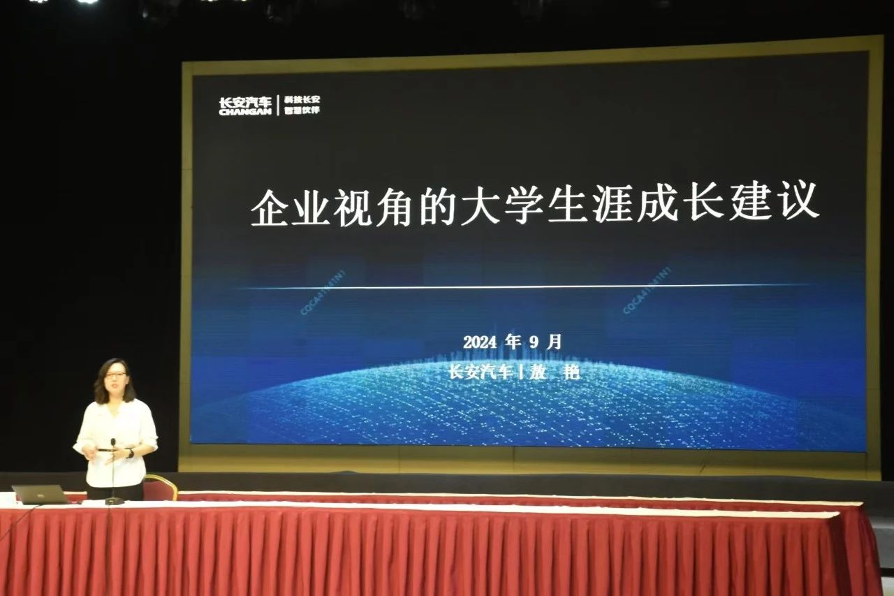 9月11日上午,长安汽车人力资源全球招聘总监敖艳女士在光大礼堂为全体新生开展“企业视角的大学生涯成长建议”专题讲座。敖艳女士从智能网联时代的到来谈起,表示汽车作为工业文明的皇冠,是所有技术和学科的集大成者,正在被新时代、新技术所重新定义。作为大型移动智能与计算终端、新型储能单元、移动多功能空间和数据采集载体,汽车产业对新时代的人才也提出了新的要求。她希望同学建立广阔、开放的思维格局,既抱有天马行空的想象与梦想,也带着乐观、坚毅的品质全方位多角度看待世界,从深度、高度、宽度、角度提升思维,淬炼职场的成熟度,注重沟通与表达、文学与写作、礼仪素养、人际感召力等方面,培养多学科交叉能力,为将来的职业发展做好充分准备。