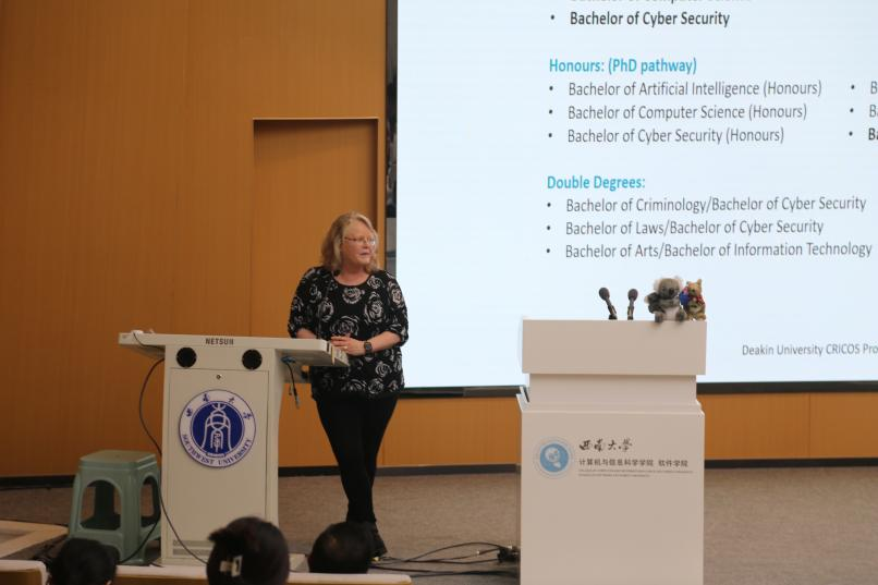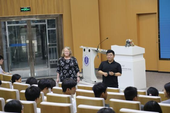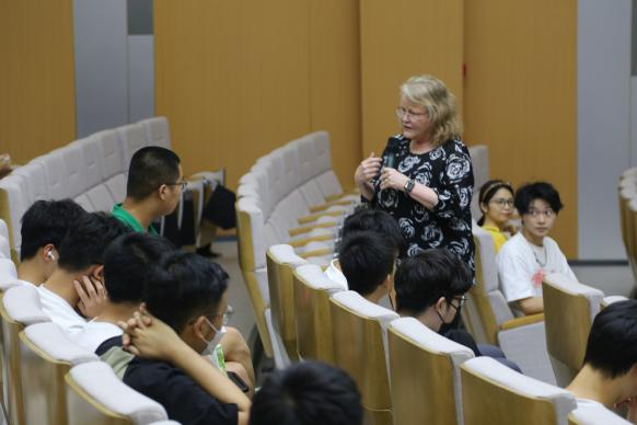 交流会上,迪肯大学信息技术韩国漫画院长Trina Myers教授首先向同学们介绍了迪肯大学的生活环境、办学资源与优势、专业方向选择以及科研项目概况,表示非常欢迎同学们加入两校的合作办学项目。随后,迪肯大学信息技术韩国漫画副院长刘晓教授为在场同学们播放由在读高年级学生录制的视频资料,让同学们更加直观地了解迪肯大学的学习经历与就读体验。刘晓教授进一步阐述了合作办学“3+2”及“2+1+1”联合培养项目的独特优势与核心特点,表明这些项目提供灵活多样的学习路径,为同学们搭建了国际化的学习桥梁。