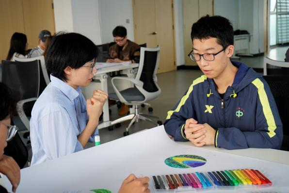 在小组共创环节,各小组成员们首先进行了自我介绍,然后在印有直径约20公分圆圈的A4纸上随性涂鸦,用各自独特的方式表达出内心想传递的情绪。在个人创作完成后,小组成员共同商讨,在纸上进一步围绕情绪圆圈绘制出内心的风景,最终共同完成了一系列充满创意与情感的作品。