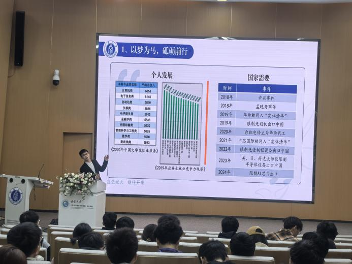 唐佳龙同学则以高考志愿选择为起点,将个人发展与国家需求结合,立志深耕电子信息领域;他强调了大学生活中“主动出击”而非被动接受的重要性,拒绝“快餐科研”的浮躁心态,注重知识的积累与沉淀。唐佳龙同学还分享了个人解压的智慧,如摘抄诗词以滋养心灵,呼吁同学们在忙碌中寻找内心的宁静。最后勉励同学们品质高于能力,唯有脚踏实地,方能行稳致远。