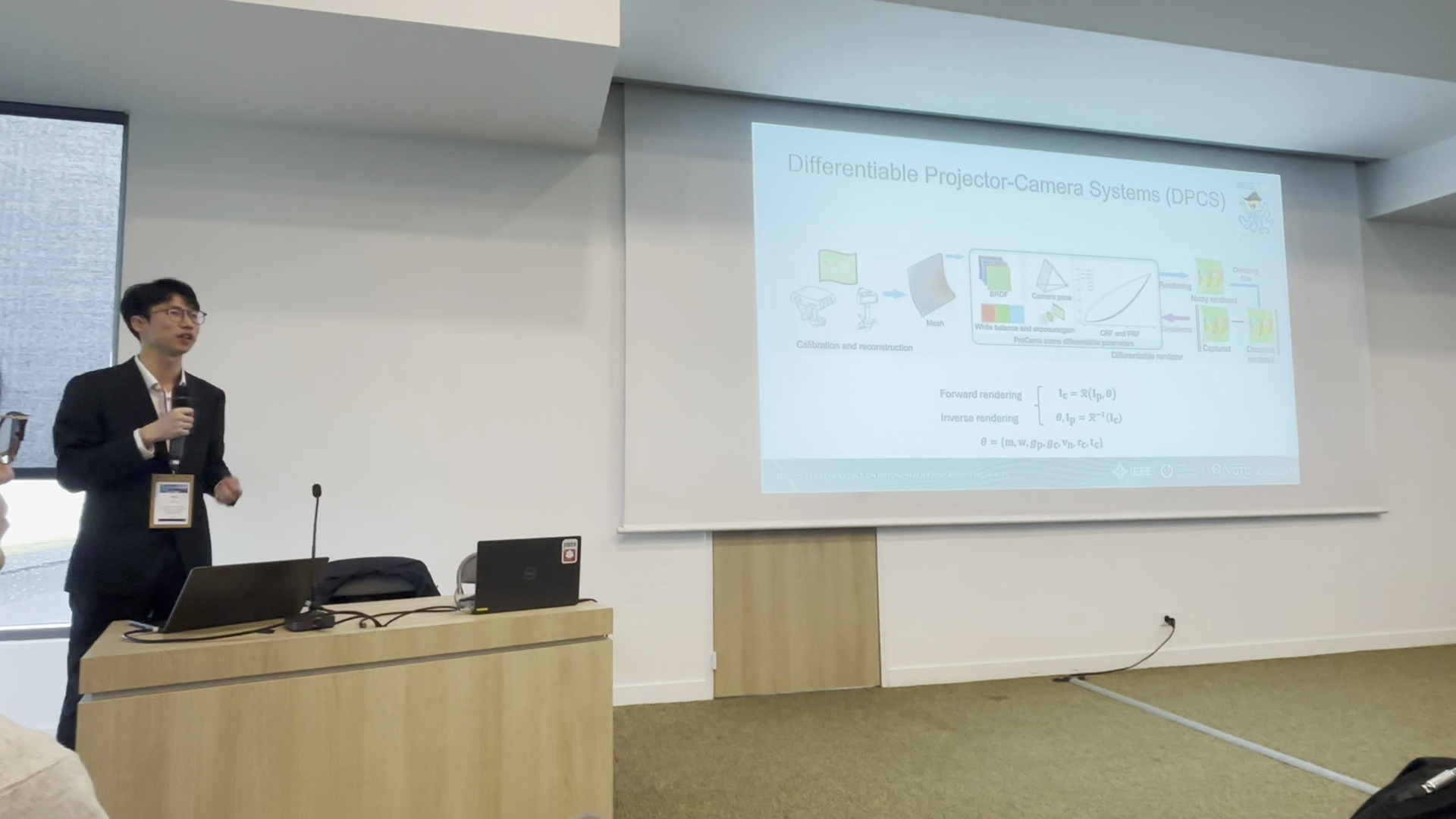 会上,韩国漫画2024级计算机科学与技术专业研究生李计江作了题为《DPCS: Path Tracing-Based Differentiable Projector-Camera Systems》的长文报告(项目和代码链接:)。该篇工作首次提出了基于可微分路径追踪算法的投影仪-相机系统,实现了对投影仪-相机系统成像过程的建模、显式解耦和仿真,为空间增强现实(SAR)的裸眼AR提供了底层算法支持。2023级网络工程专业本科生邓宇宸在会上作了题为《LAPIG: language guided projector image generation with surface adaptation and stylization》的长文报告(项目和代码链接:)。该篇工作首次提出了基于语言指导的投影表面风格迁移,为基于投影的裸眼AR提供了新颖的内容生成和交互方式。