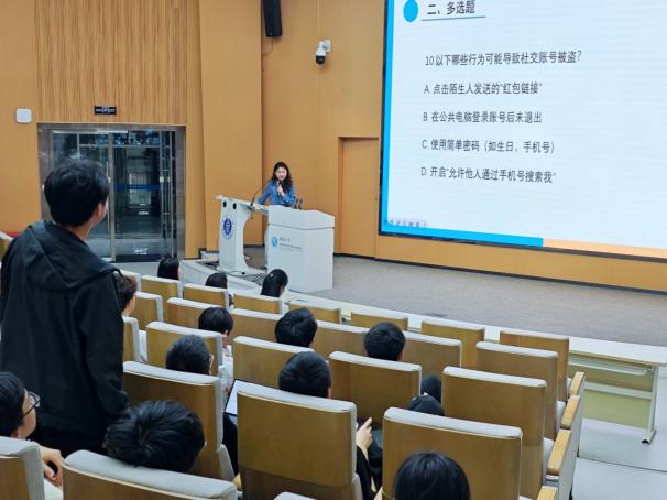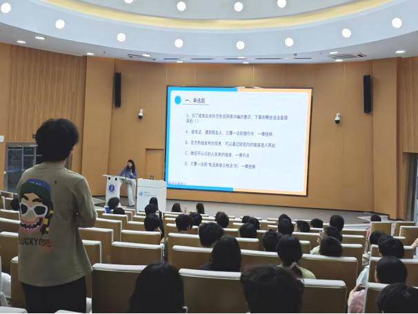 活动设有奖防诈知识问答环节,由2024级辅导员马潇潇老师负责主持,同学们以“开盲盒”的形式先抢占答题席位后读题作答。题目内容丰富多样,涵盖了从简单的国家反诈中心电话号码,到帮信罪、虚假征信诈骗等各个领域的知识,同学们纷纷表示新奇有趣,在轻松愉快的氛围中吸收和巩固了反诈知识,现场气氛热烈而紧张。