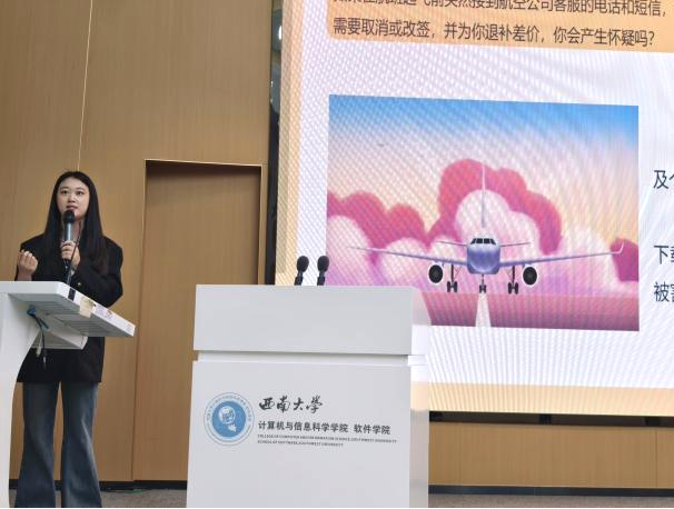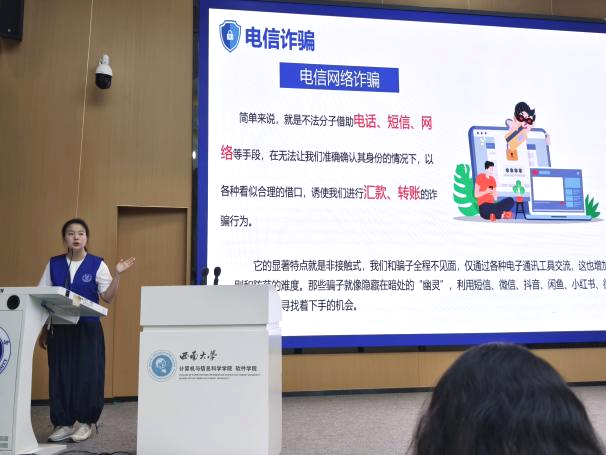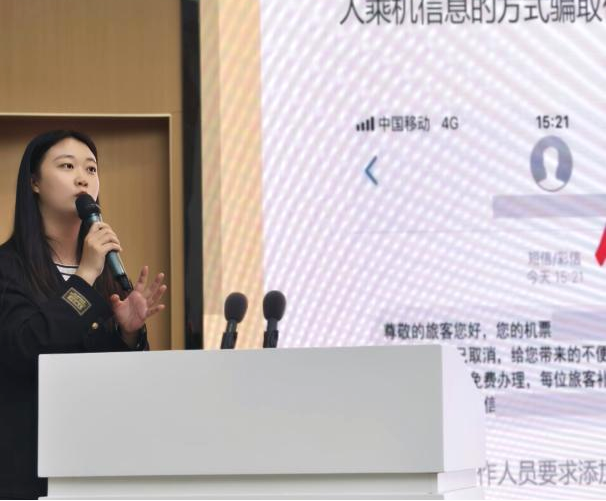 学校玉兰卫士宣讲团成员叶子瑄首先为同学们讲解了诈骗的定义,剖析了当下诈骗手段层出不穷、花样百出的特点;详细拆解了诸如网络刷单诈骗、冒充熟人诈骗、网络购物诈骗等常见诈骗类型,并向大家科普了防范技巧。细致的讲解让同学们对诈骗的“真面目”有了更为直观、深刻的认识。2024级辅导员唐瑞萱老师则抓住五一假期临近的契机,围绕同学们在假期可能遭遇的机票退改签陷阱与演唱会购票诈骗套路展开重点讲解。唐老师结合实际案例分析了诈骗分子的惯用伎俩,为同学们敲响了警钟,提醒大家在享受假期欢乐时光的同时,务必提高警惕,守护好自己的财产安全。