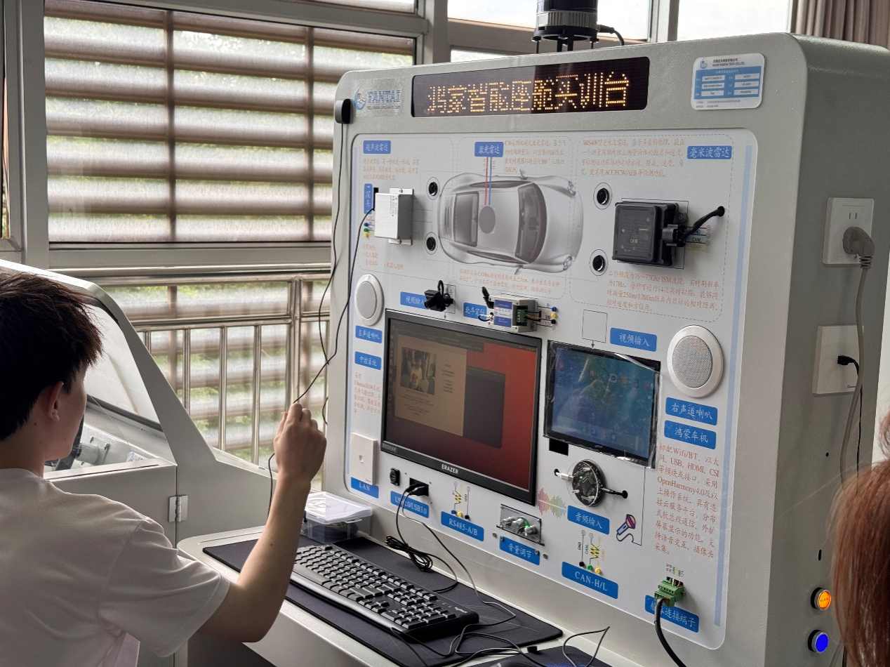 参观农业物联网后,同学们热情未减,随即转场至鸿蒙智能座舱实训台。这里是硬核技术的体验场:学生亲手操作传感器,感受数据在座舱内高速流转与智慧联动,深入了解鸿蒙车机开发套件的强大潜能。从人车交互到辅助驾驶的前沿动态,同学们得以近距离触摸未来出行的强劲脉搏,对科技创新引领的交通变革赞叹不已。