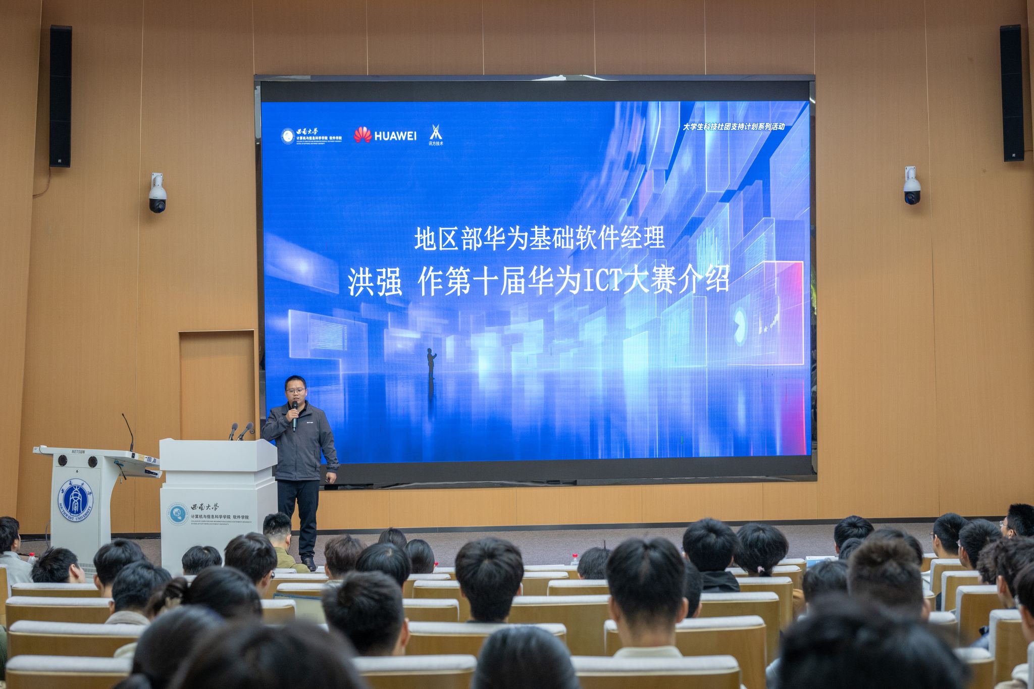 地区部华为基础软件经理洪强先生详细介绍了第十届华为ICT大赛的六大赛道,重点讲解了实践赛中 的基础软件、生成AI赛道以及首次纳入大赛的仓颉编程赛道。他说明了各赛道的考察内容、时间安排与晋级规则,介绍了华为所提供的丰富学习资源,包括线上课程、真题解读、职业认证加分政策等,鼓励学生积极组队参赛。