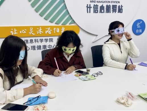 “心灵旅行”环节则为这场活动注入了温暖的深度。一人蒙眼扮演“旅行者”,另一人化身“导航员”,通过语言描述帮助同伴绕过预设障碍。这不仅是一场默契的考验,更是一次信任的建立。同学们在小心翼翼的探索与耐心的引导中,不仅锻炼了沟通表达能力,更在彼此的托付与支撑中建立起坚实的信任,现场涌动着温暖与鼓励的暖流,让情绪在信任的氛围中得到温柔解码。