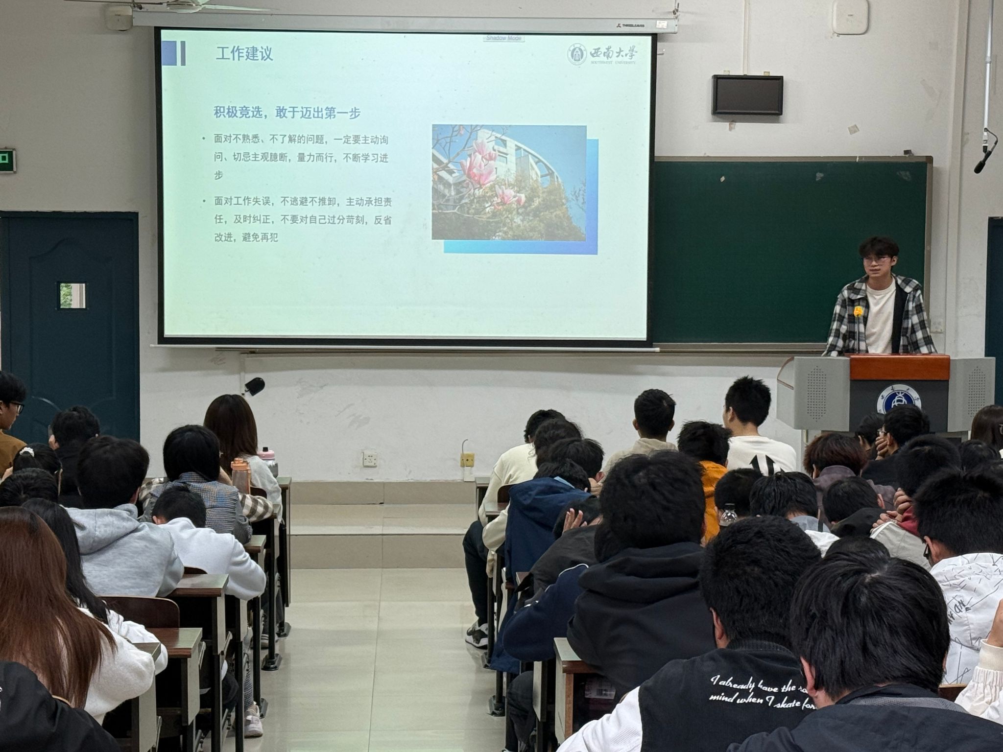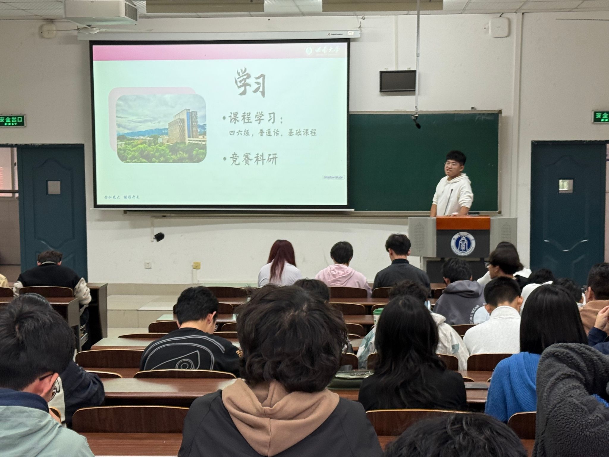 杨成鹏通过班长任职经历,分析大学和高中的差别,助力新生实现角色转变;雷心怡以“学业领航”为题,梳理学科学习和毕业发展前路,提供实用规划建议;邓凯瑜从心态、时间、生活三维度分享自我管理经验,给出处理宿舍关系、校园恋爱与培养兴趣的建议;崔岩峰以幽默风格分享辩论与摄影社团的收获,鼓励新生按自身节奏选择生活方式;廖欣然分享通过攀岩、篮球等运动释放压力的心得,还推荐校园周边美食,让分享更具生活温度;代双遥鼓励大家“别怕犯错”,强调反思与明确方向的重要性;邱艺芸则以“以奋斗之我,绘青春光彩”作结,用激昂演讲鼓励学弟学妹将奋斗精神贯彻大学生活始终。