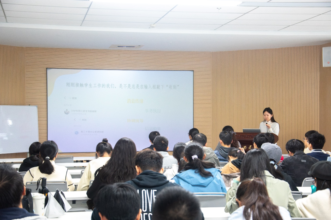 科研与专业技能方面,谢珺皓系统介绍本科生参与科研的意义与路径,详解计算机领域主要研究方向以及论文查阅工具的使用方法;豆柯锐从“课程分类”切入,帮助新生构建大学学习整体框架。学生工作与志愿服务领域,谢明彤解析校院级组织运作模式,传授“短期集中投入+定期复盘”的平衡技巧;林冉结合韩国漫画学生会经历,鼓励新生保持求知进步热情;杨佑齐详解志愿活动时长要求、身份认证、参与途径等实操流程,鼓励新生在服务中丰富阅历;陈晓雨衫则分享平衡学生工作与学习的实用技巧,介绍易入手的竞赛项目与入门方法。