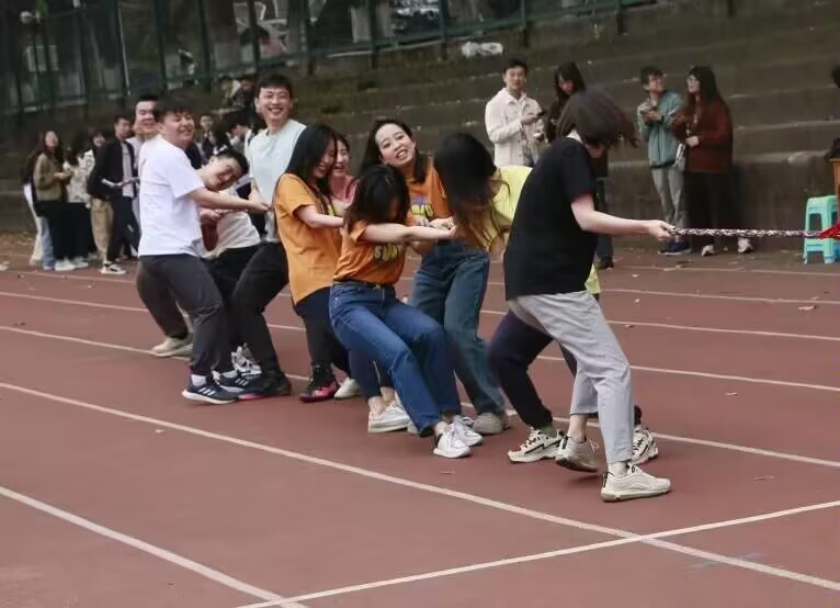 开幕式后,“师生拔河赛”、“师生篮球赛”和趣味运动会相继开展。“加油,加油!”在同学们的一声声呐喊中,辅导员老师和同学们各自拼劲全力拔河。一声吼,一股劲,红绳不断摇摆,双方队伍互不相让,汗水挥洒赛场。三局过后,最终,辅导员老师队伍获得胜利。“师生拔河赛”拉近了老师和同学们的距离,使师生之间联系更紧密,老师和同学们都沉浸在拔河的欢声笑语中。