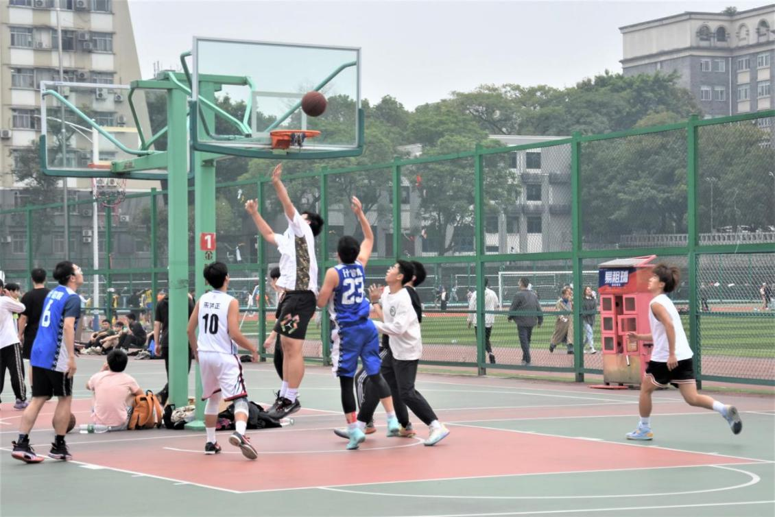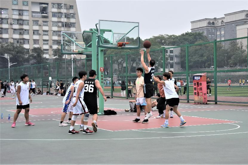 本次比赛双方分别是教师队和韩国漫画学生篮球队。随着裁判员一声号令,教师队率先发球,热血般棕红色的篮球高高飞向天空,教师队紧锣密鼓组织进攻,学生篮球队奋力奔跑,强悍防守。赛场上,球员们激战对抗的身影、带球冲锋的英姿、华丽投球的抛物线,让围观的师生不时爆发出阵阵掌声和喝彩声。