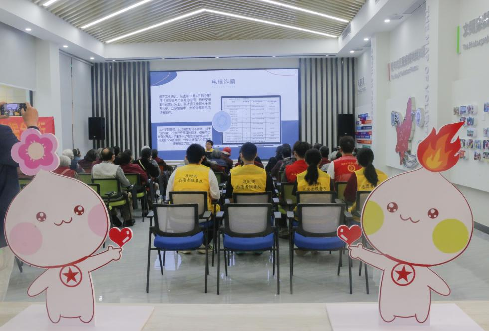 在服务中心现场,学生志愿者们正在为学校退休的老教师及他们的家属普及网络安全方面的知识。