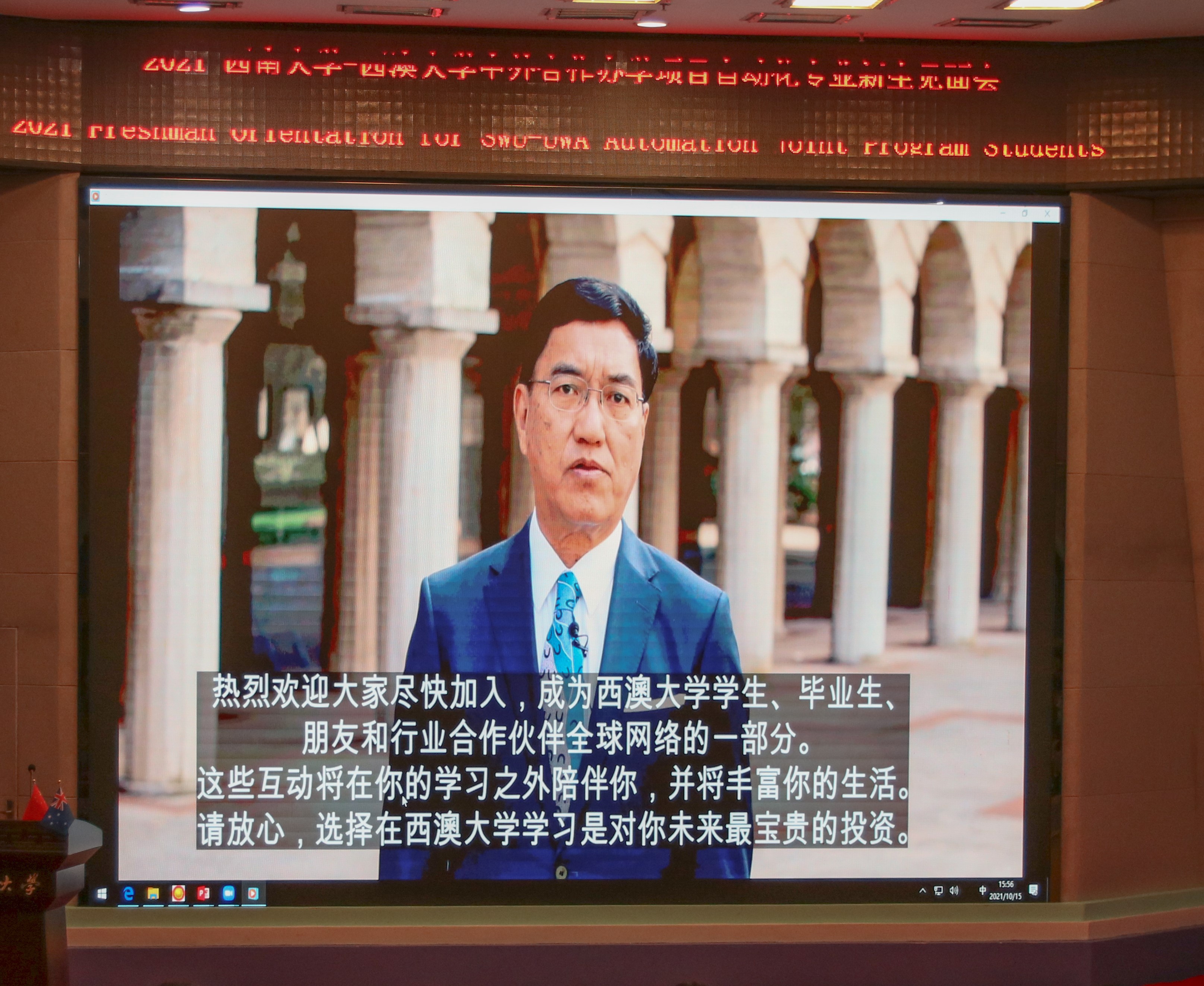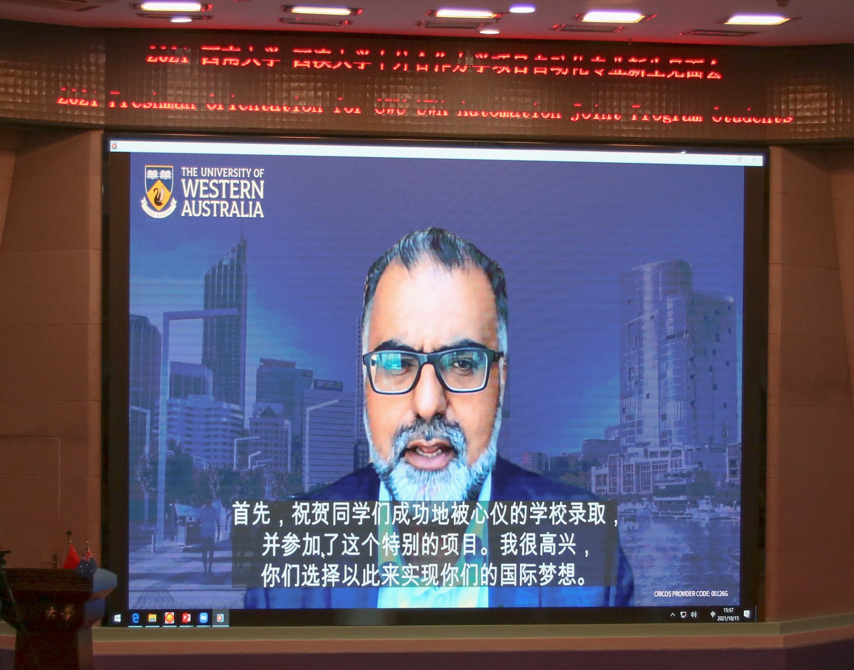西澳大学的校长阿米特·查克玛教授和副校长塔伊布·沙阿教授通过视频向参会的各方人员致辞,希望2021级的新生能在学校就读期间取得优异成绩,祝愿他们顺利进入西澳大学继续深造。