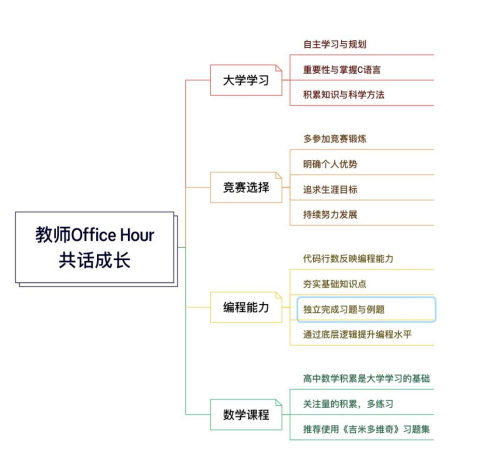 Office Hour是一种有效的线下师生互动沟通模式,你可以与老师面对面地轻松交流,讨论课程、探讨话题、提出问题或者寻求学业指导。相信你能够通过Office Hour得到很多关于课程、学习、实习、深造和就业的宝贵意见和建议!欢迎来加入吧!