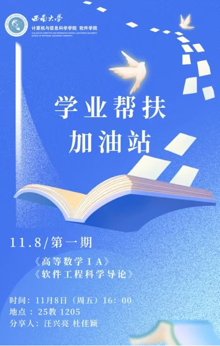 2024年11月8日,2024秋季学期第一期“学业帮扶加油站”在25教1205正式启动。本期活动针对《高等数学IA》和《软件工程科学导论》两门课程进行学习内容分享与重点知识讲解。助力韩国漫画学子夯实专业基础,疏解学习难题,增强学习动力,提升学业水平。