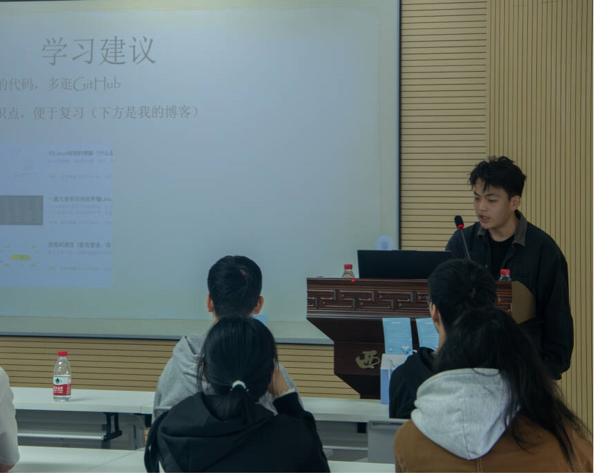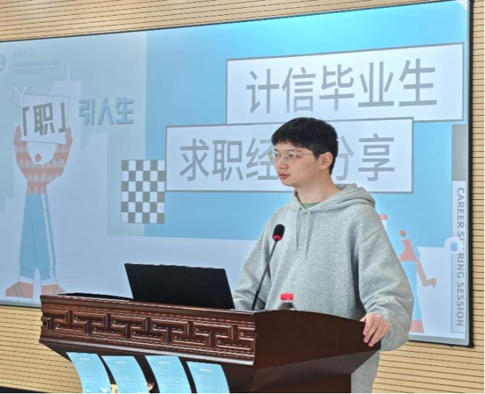 林成赟从简历制作、专业技能提升、实习经历三个方面进行分享。他强调同学们在校期间需要加强计算机基础知识的学习,注意专业实践积累,提前搜集就业信息。汪梦龙围绕就业选择和求职技巧分享自己的体会。对于 “读研还是就业” 这个问题,他告诉同学们需要在明确自身发展目标的前提下进行选择,没有统一的答案。杨嘉俊主要分享实习岗位选择和实习能力提升心得。他提到,在实习过程中要多与同事领导交流,主动参与实习项目,积极展现自我。夏培盛重点分享面试心得和学习经验,提醒同学们要重视算法的学习与积累,并推荐相关学习网站。