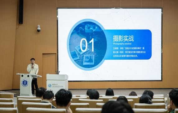 王煜翔首先分享自己对于拍照的个人见解,他从设备使用的变化说起,分析不同设备的优势与缺点,然后向大家展示自己运用不同设备在世界各地捕捉到的精彩瞬间,如蒸汽机车、青岛奥帆中心、重庆轻轨站等。他提出不同的风景需要采用与之适配的构图方式,通过裁剪、旋转画面以及将主体置于画面中央等手法,能够更好地凸显摄影作品的艺术魅力,并鼓励同学们在摄影实践中探索个性化表达。