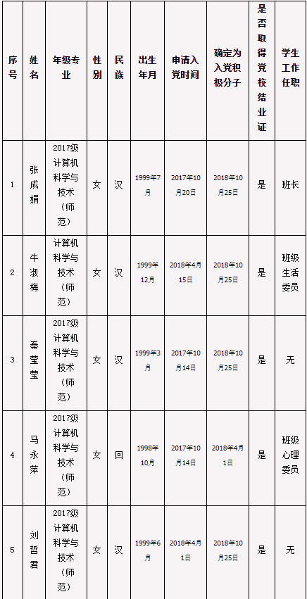 公示期满后将对发展对象进行政治审查,进一步考察培养。具体名单如下: