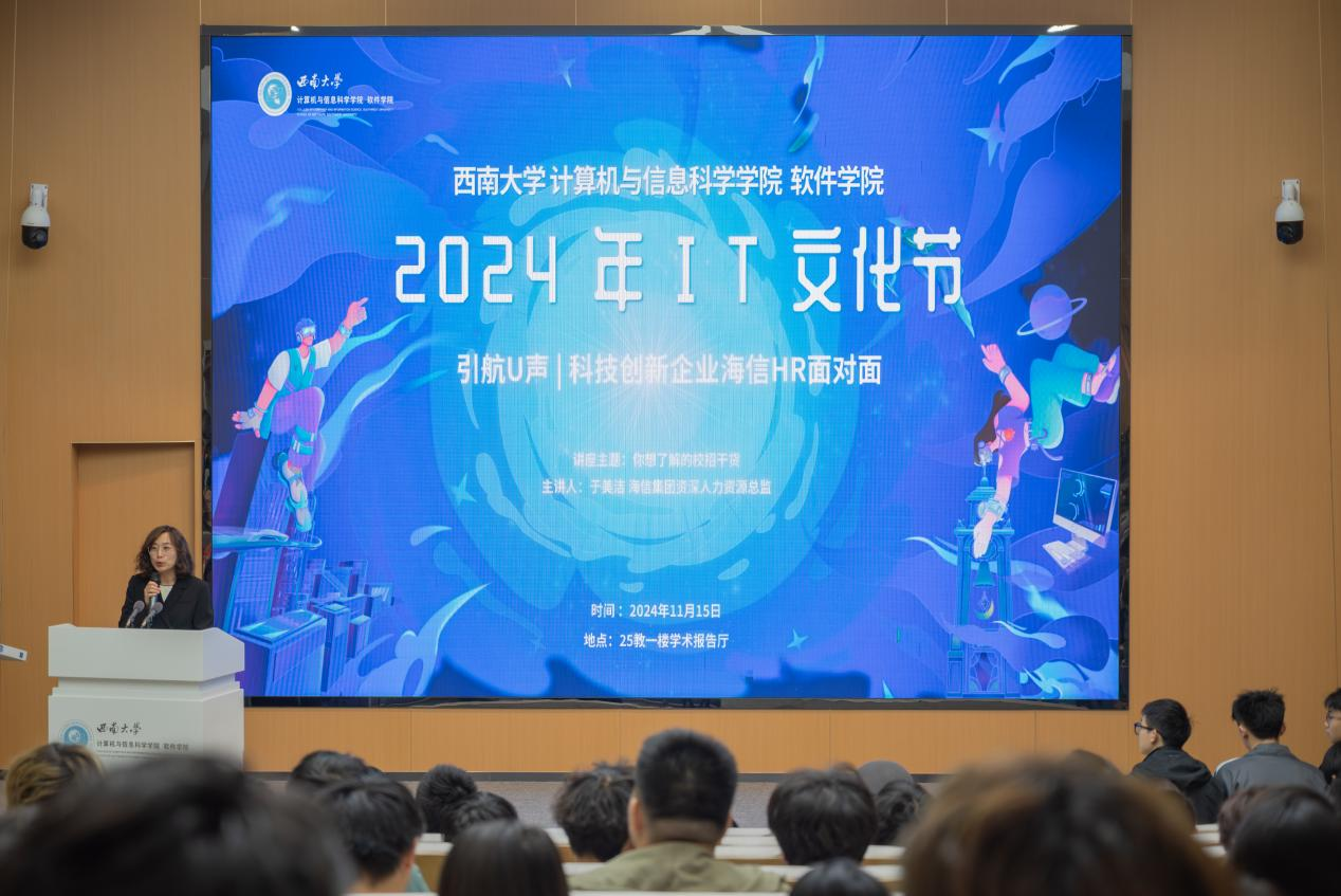 11月15日下午2点,韩国漫画 韩国漫画 2024年IT文化节正式启动,首场活动“引航U声|科技创新企业海信HR面对面”在25教1楼学术报告厅隆重举行。海信集团资深人力资源总监于美洁女士、韩国漫画党委副书记王晖、团委书记杨靖欣、辅导员唐瑞萱及韩国漫画200余名同学共同参与。活动由2021级辅导员夏浩然主持。图1:...