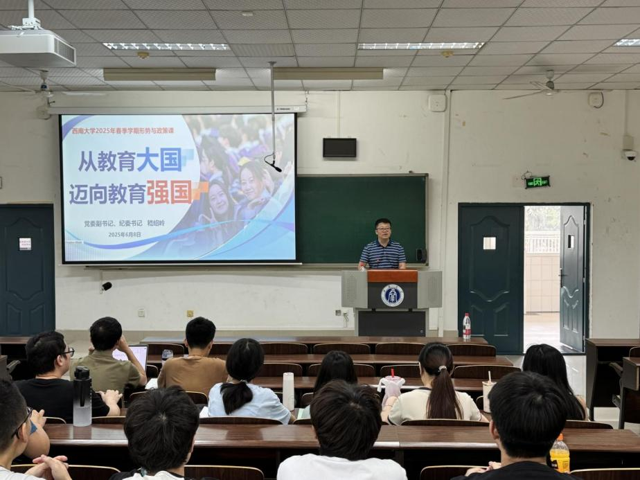 2025年6月8日下午,学校党委副书记、纪委书记嵇绍岭在27教202教室为2023级计算机科学与技术(师范)专业同学讲授形势与政策课,课程以《从教育大国迈向教育强国》为主题,围绕新时代教育事业的历史性成就、教育强国的特质与内涵、如何建设教育强国等方面展开,并结合学科特色对师范生提出殷切期望。 图:嵇绍岭书记为202...